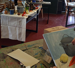Die Teilnehmenden entwerfen Skizzen und Farbentwürfe und malen eigene Ölbilder auf Leinwände.